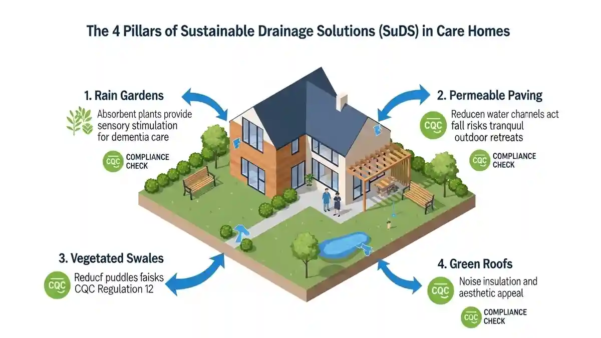 The future of sustainable drainage solutions CQC care home design is the integration of SuDS (Sustainable Drainage Systems). In Hockley, Policy EN18 of the Local Plan encourages SuDS to manage surface water runoff, which often plagues the surrounding area.